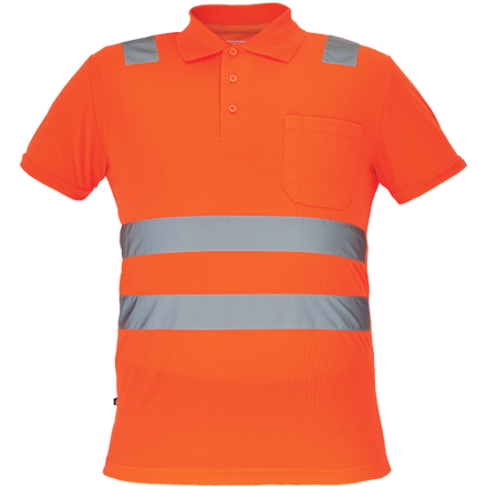 • pánska full Hi-Vis polokošeľa s reflexnými doplnkami cez ramená a v bokoch o veľkosti 5 cm • zapínanie na 3 gombíky • 1 náprsné vrecko • rebrovaný golier a lemy rukávov